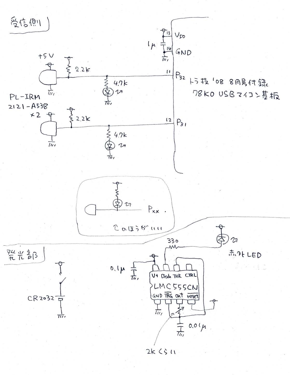 発光部はリモコンの変調周波数に合わせて38kHzくらいで点滅させている。